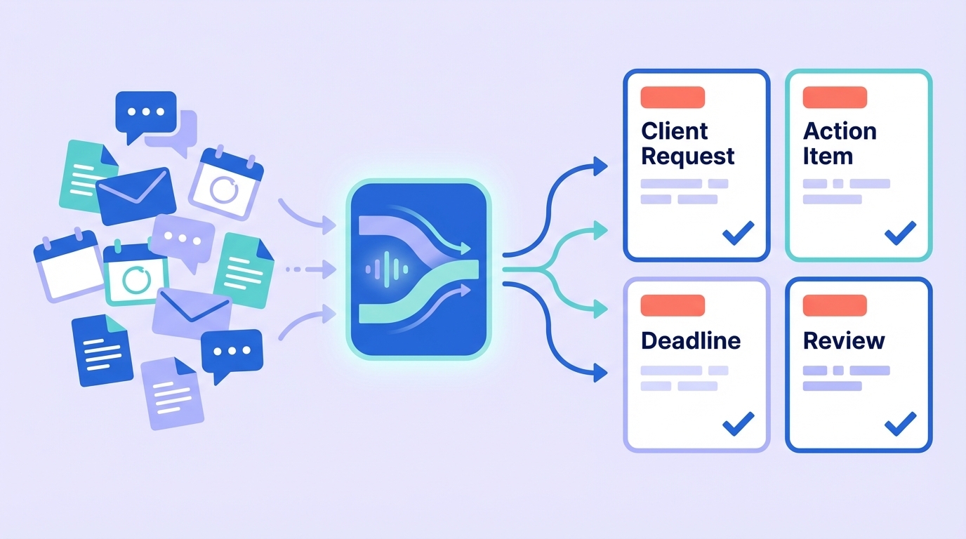 Professionals are inundated with a constant stream of information from emails, Slack messages, and meeting notes. Manually sorting through these communications to find actionable tasks, client feedback, and project updates is a significant drain on time and mental energy. This reactive workflow leads to missed deadlines, communication gaps, and a constant feeling of being behind.
