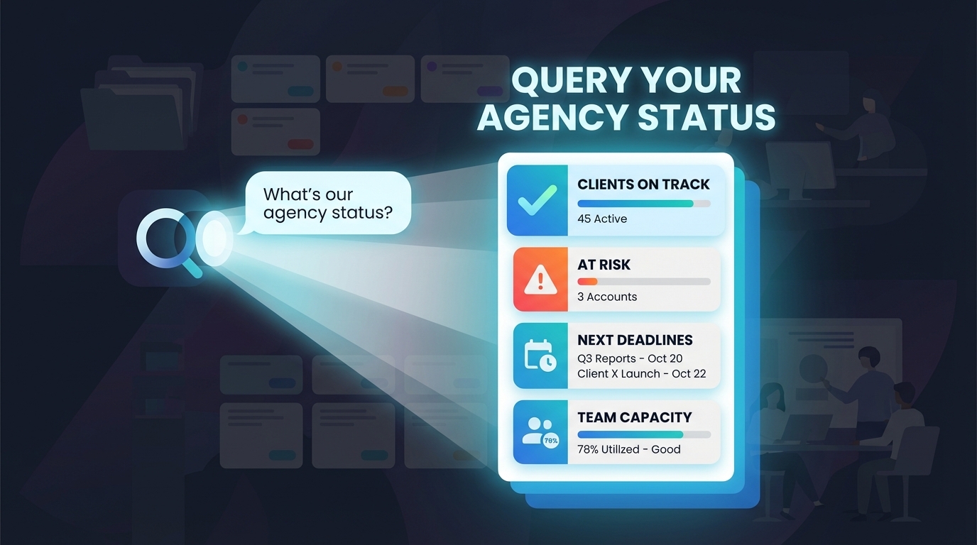 For most agencies, information lives in silos. Project updates are buried in email threads, tasks are tracked in a project management tool, client feedback is stuck in Slack channels, and key insights exist only in meeting transcripts.