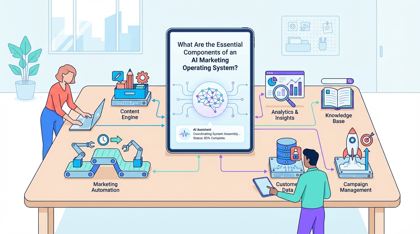 An AI marketing operating system is a unified framework of five core components: a centralized data and knowledge layer, an AI model intelligence layer, a workflow automation engine, a governance and oversight layer, and a measurement feedback loop. It connects your proprietary data to AI-driven workflows.