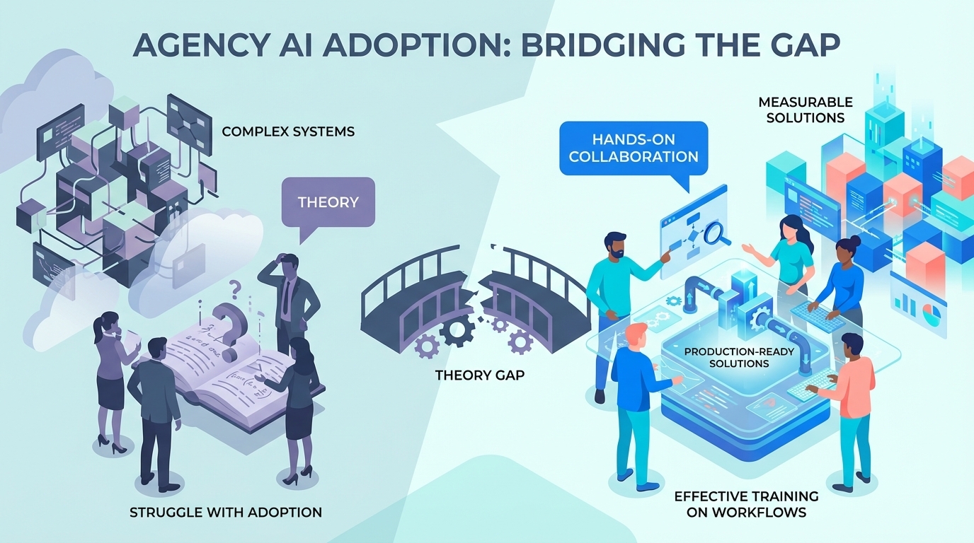 Agencies adopting AI struggle because theoretical knowledge doesn't translate to their messy, real-world tech stacks and client demands. Success requires hands-on training to redesign specific workflows, integrate tools, and build measurable, production-ready systems that actually improve margins and service delivery.